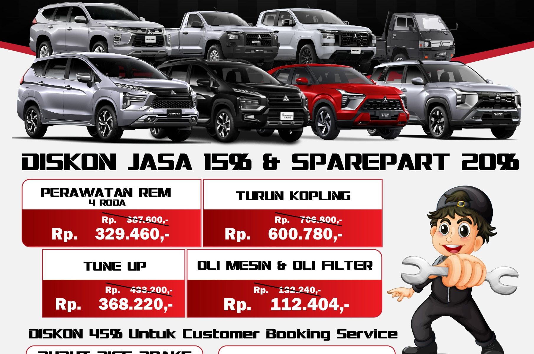 Dapatkan Diskon 15% untuk jasa dan 20% untuk sparepart disetiap perawatan rem 4 roda, Turun kopling, Tune Up dan penggantian Oli Mesin dan Filter Oli untuk kendaraan Mitsubishi anda.