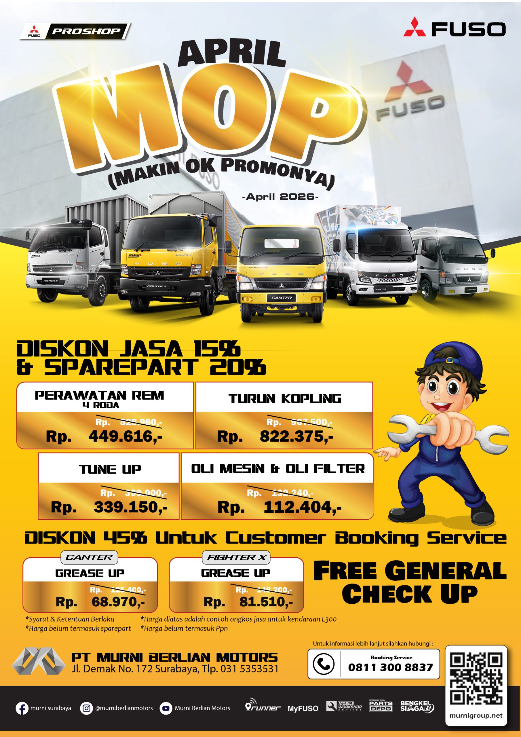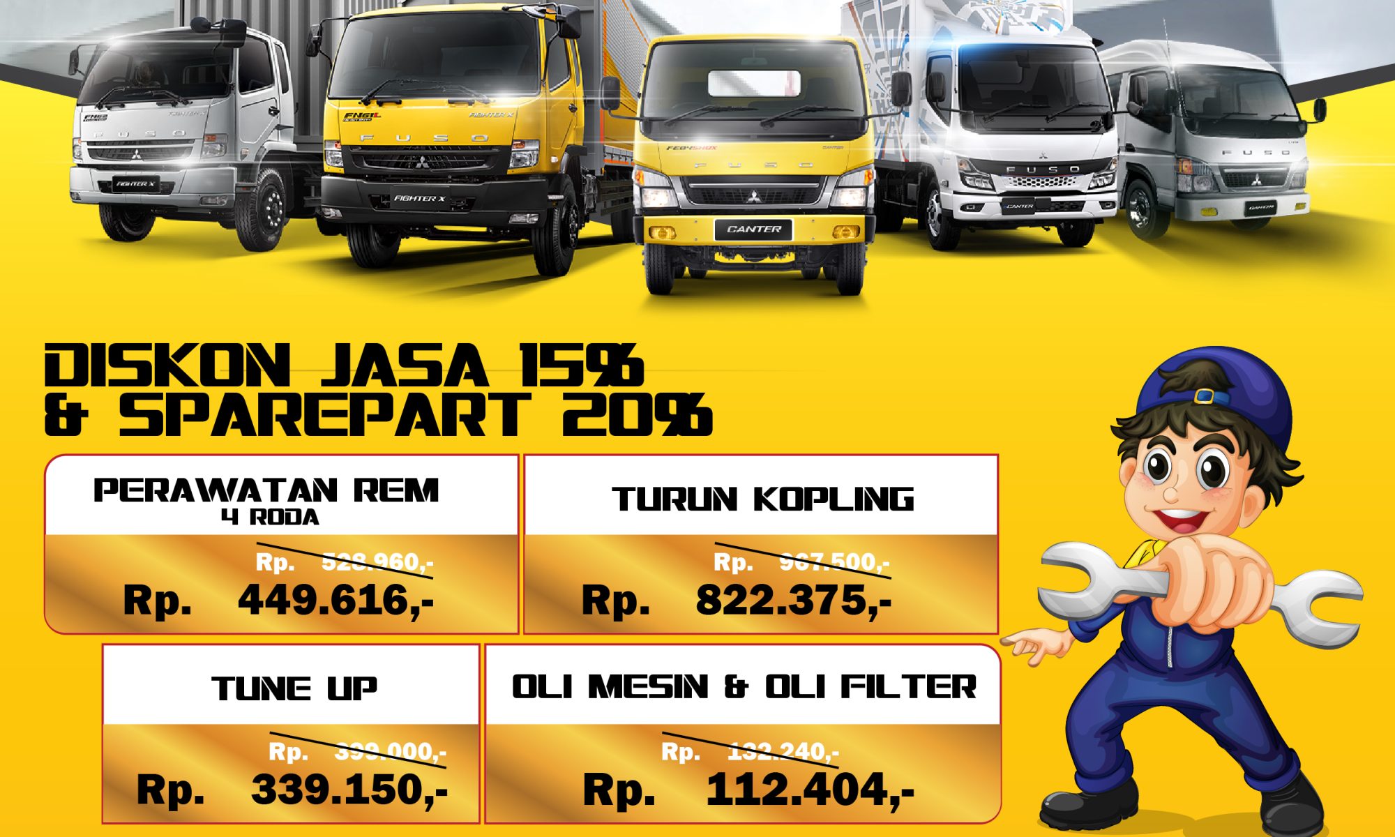Dapatkan Diskon 15% untuk jasa dan 20% untuk sparepart disetiap perawatan rem 4 roda, Turun kopling, Tune Up dan penggantian Oli Mesin dan Filter Oli untuk kendaraan Mitsubishi Fuso Canter dan Fighter X.