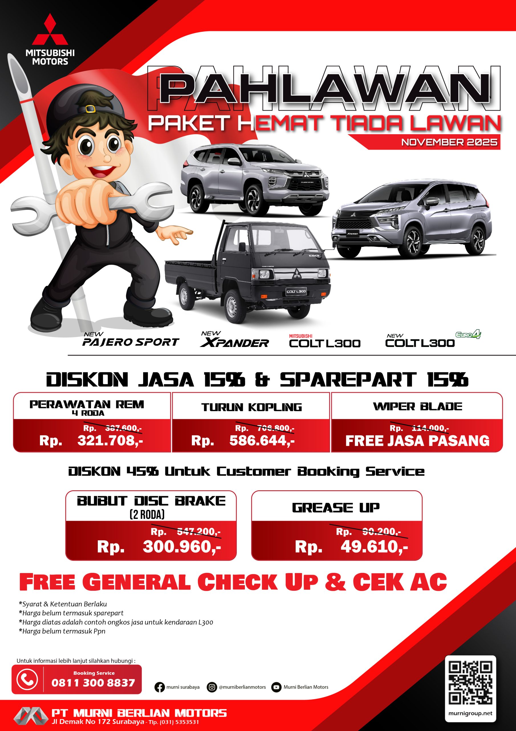 Dapatkan Gratis Jasa disetiap Penggantian Oli Mesin dan Filter Oli untuk kendaraan Mitsubishi Pajero, Xpander, Colt L300 anda. Serta dapatkan Harga khusus untuk setiap melakukan Grease Up bagi Konsumen yang melakukan Booking Service.